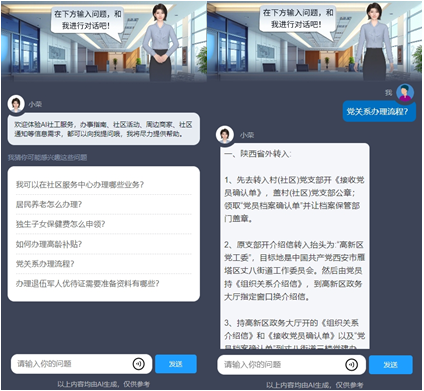 “新生儿居民医保怎么办理?”“临近毕业,党组织关系如何转接?”“残疾人两项补贴如何申领?”对于这些民生关切的问题,枫林绿洲社区系统梳理出居民反映集中的高频需求,联合西安荣天信息技术有限公司,探索“AI+社区”智慧模式,通过AI数字人将居民海量、碎片化的需求转化为结构化数据,并集成至“枫林绿洲智慧社区”微信公众号平台。